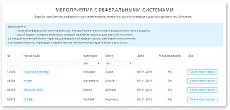 • заробляйте на реферальних нарахуваннях, допомагаючи організаторам з розповсюдженням квитків